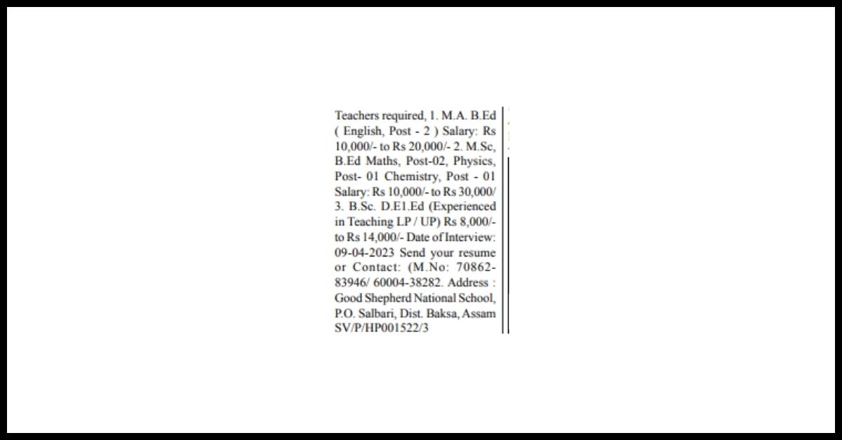 Teacher required in Good Shepherd National School, Baksa NAME OF POST: Teacher NO OF VACANCIES: 6 EDUCATIONAL QUALIFICATION: B.Sc, MA or M.sc BE.d, D.EL.Ed EXPERIENCE: Click here for official advertisement